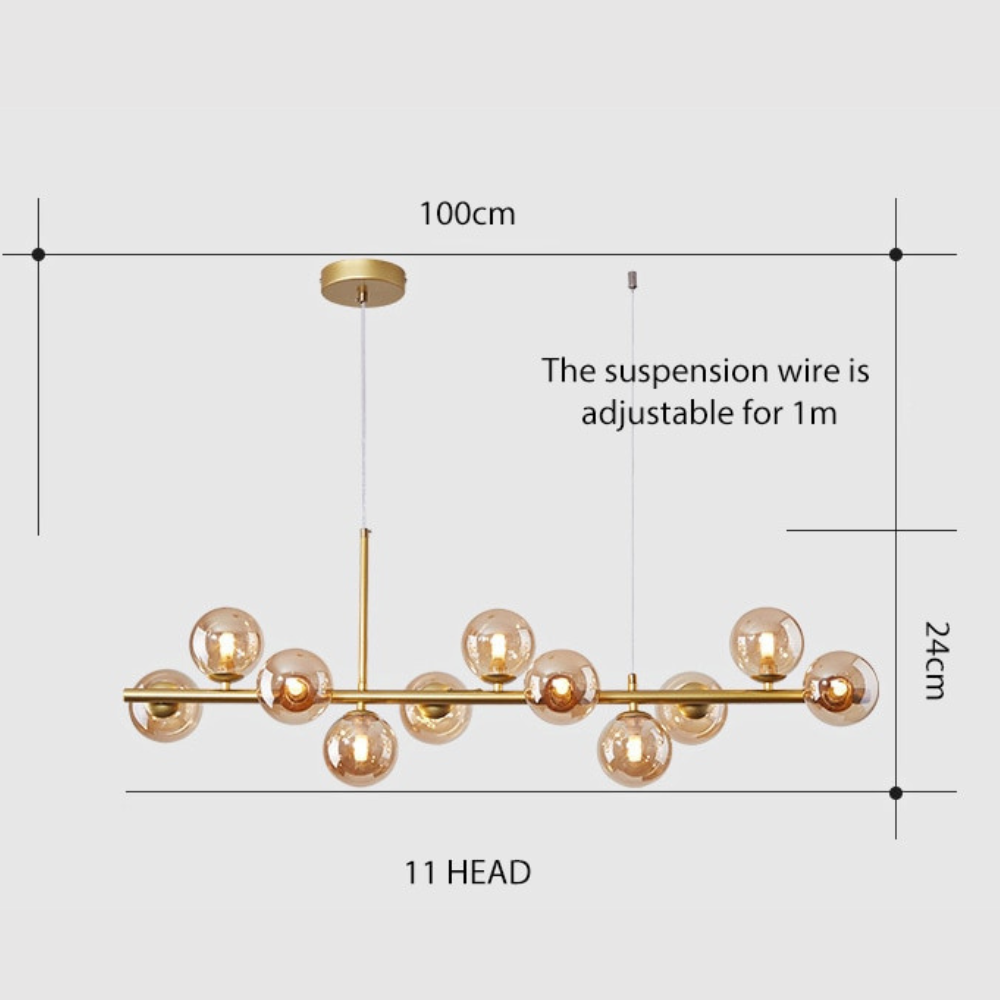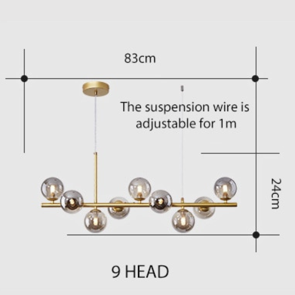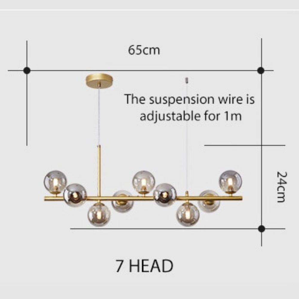 This stylish Chandelier Glass Ball Suspension is designed to add modern elegance to any living space. Featuring an LED-powered gold light with 7, 9, or 11 glass heads, it is perfect for kitchen, living, and dining room décor. The Nordic modern design provides an impressive yet subtle look.