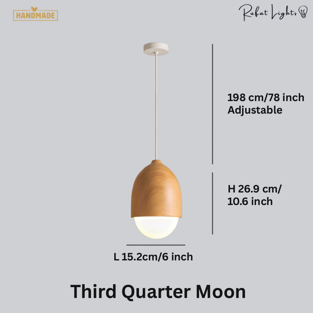 Half Moon: 25.4 cm (W) × 25.4 cm (H) (10" W × 10" H) Full Moon: 25.4 cm (W) × 22.9 cm (H) (10" W × 9" H) Waning Moon: 15.2 cm (W) × 26.9 cm (H) (6" W × 10.6" H) Third Quarter Moon: 15.2 cm (W) × 26.9 cm (H) (6" W × 10.6" H) Adjustable Pendant Length: 200 cm (H) (78" H) |