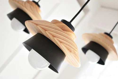 That features a combination of wood and metal layers with integrated LED lights. The layered design creates a unique and modern aesthetic that is both functional and visually appealing. The LED lights provide energy-efficient illumination, making them an eco-friendly choice for lighting up a space.