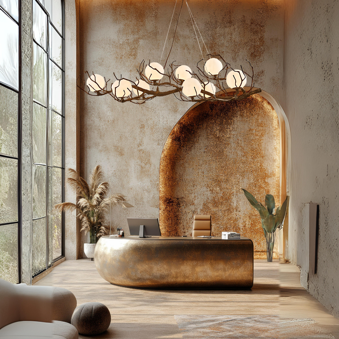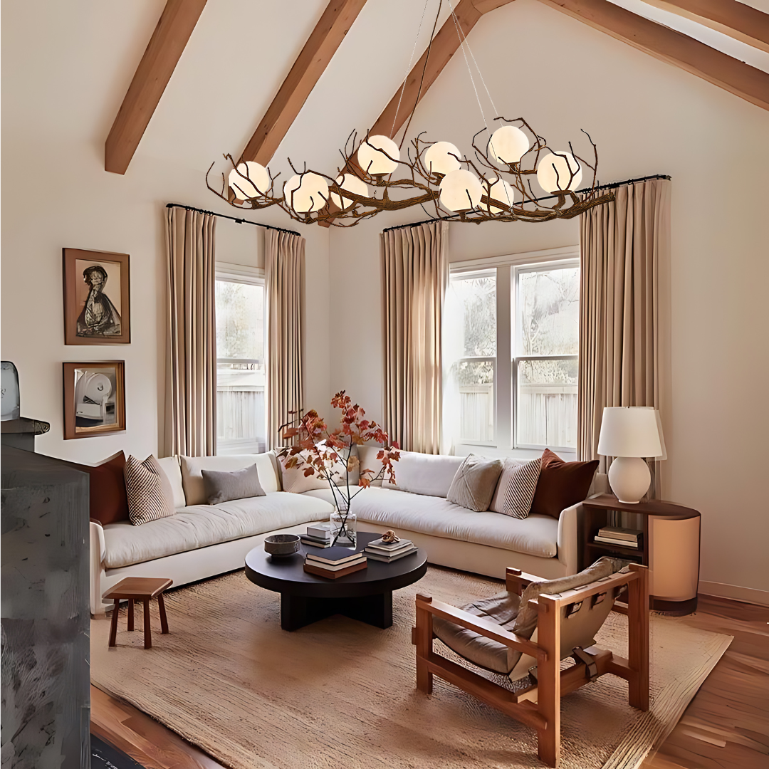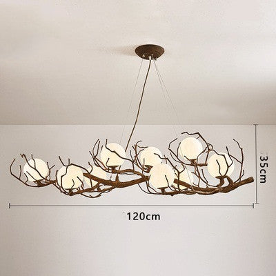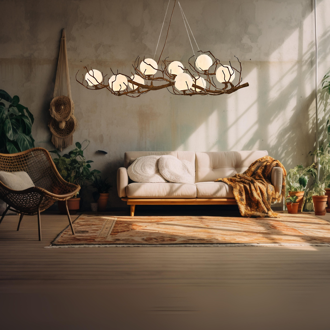 Crafted from metal with a hand-brushed finish that mimics the look of wood grain, the Nordic Tree Retro Moon Chandelier has been expertly handmade with a "retro black" aesthetic, though its deep brown hue resembles that of natural wood. The bulb is uniquely made with a shatterproof, eco-friendly rubber coating, giving it a textured appearance similar to rubber or plastic.
