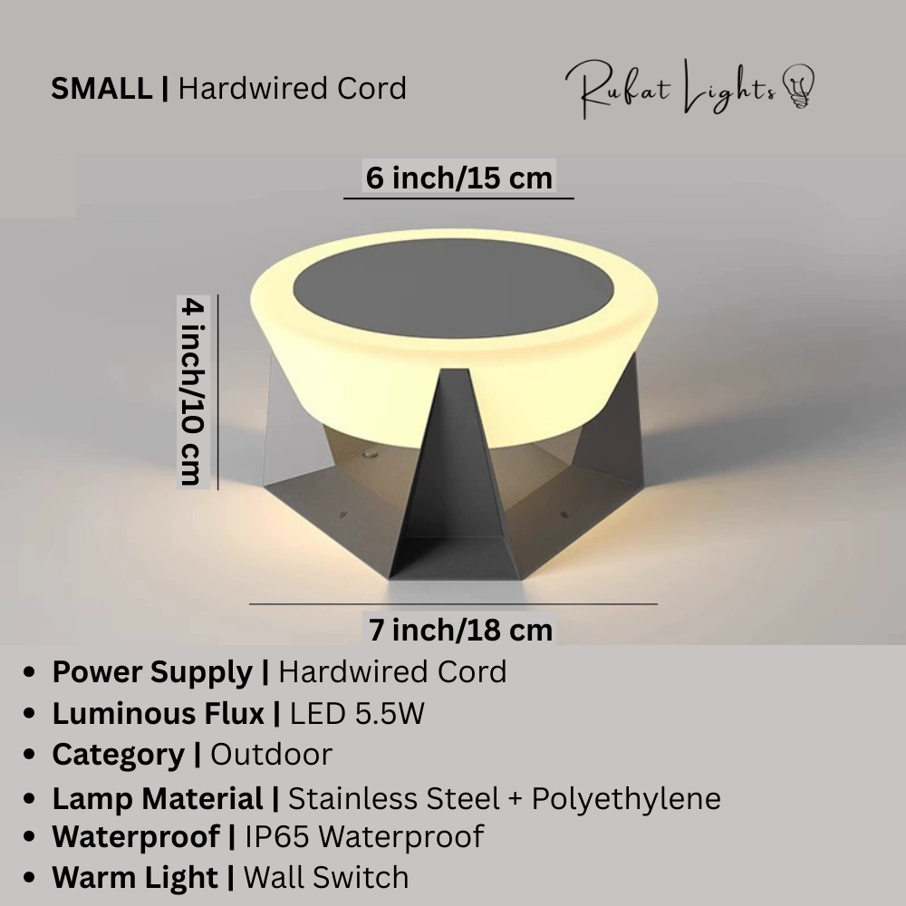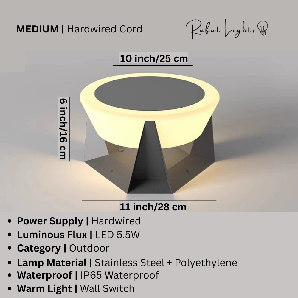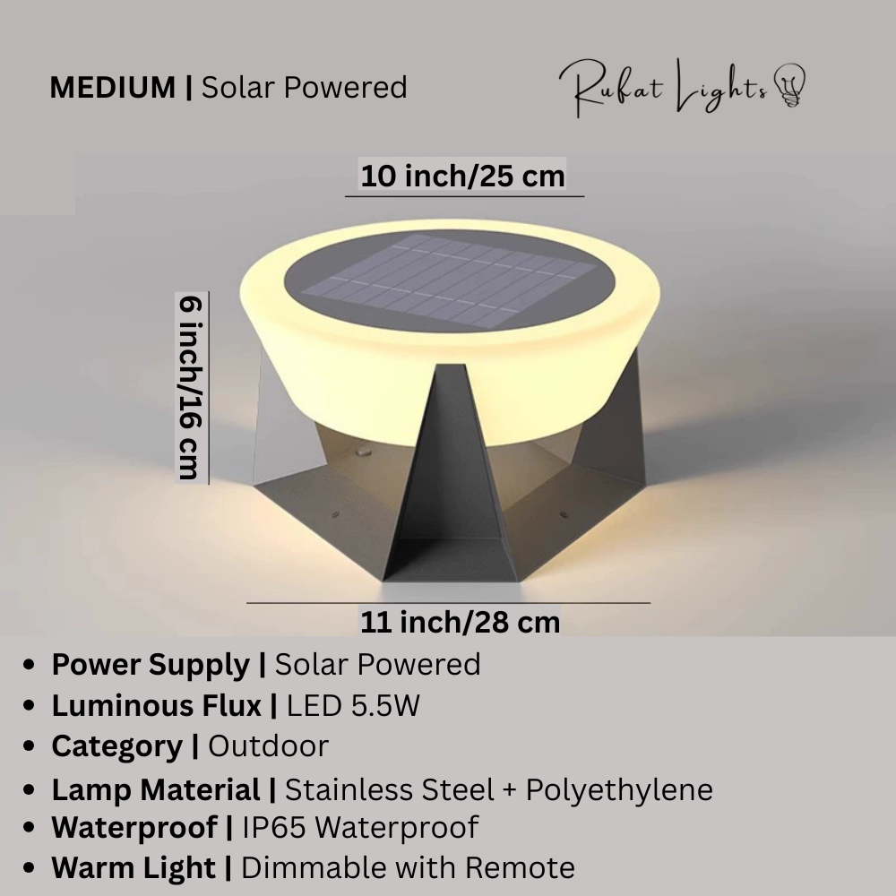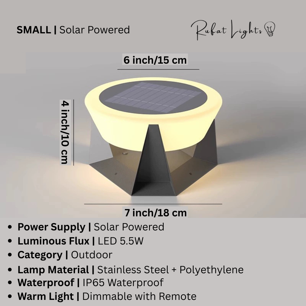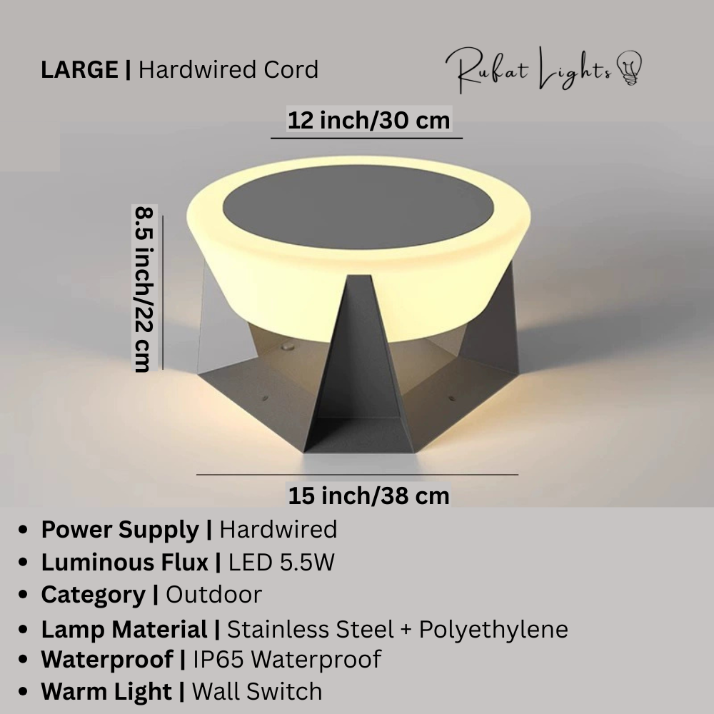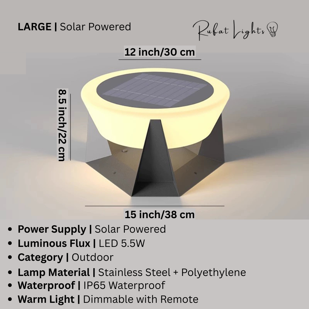 This Outdoor Solar Lamp is crafted from high-quality waterproof materials, ensuring durability and reliable performance in all weather conditions. Rated IP65, it offers excellent resistance to water and rust, making it ideal for outdoor use. The lamp features a dimmable function controlled via remote (for the Solar version) and a Hardwired option that operates via a wall switch.